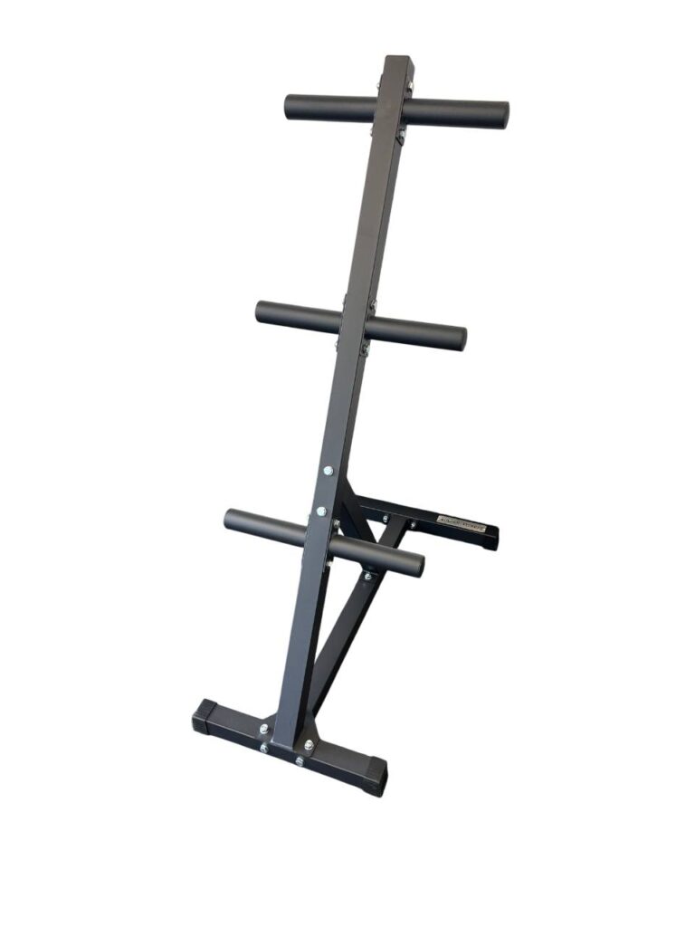 The Olympic Plate Tree Storage Rack provides organized storage for 2” Olympic plates and bumpers, featuring a durable steel construction with a stable base to prevent tipping. Its compact design ensures efficient use of gym space while supporting heavy-duty use.